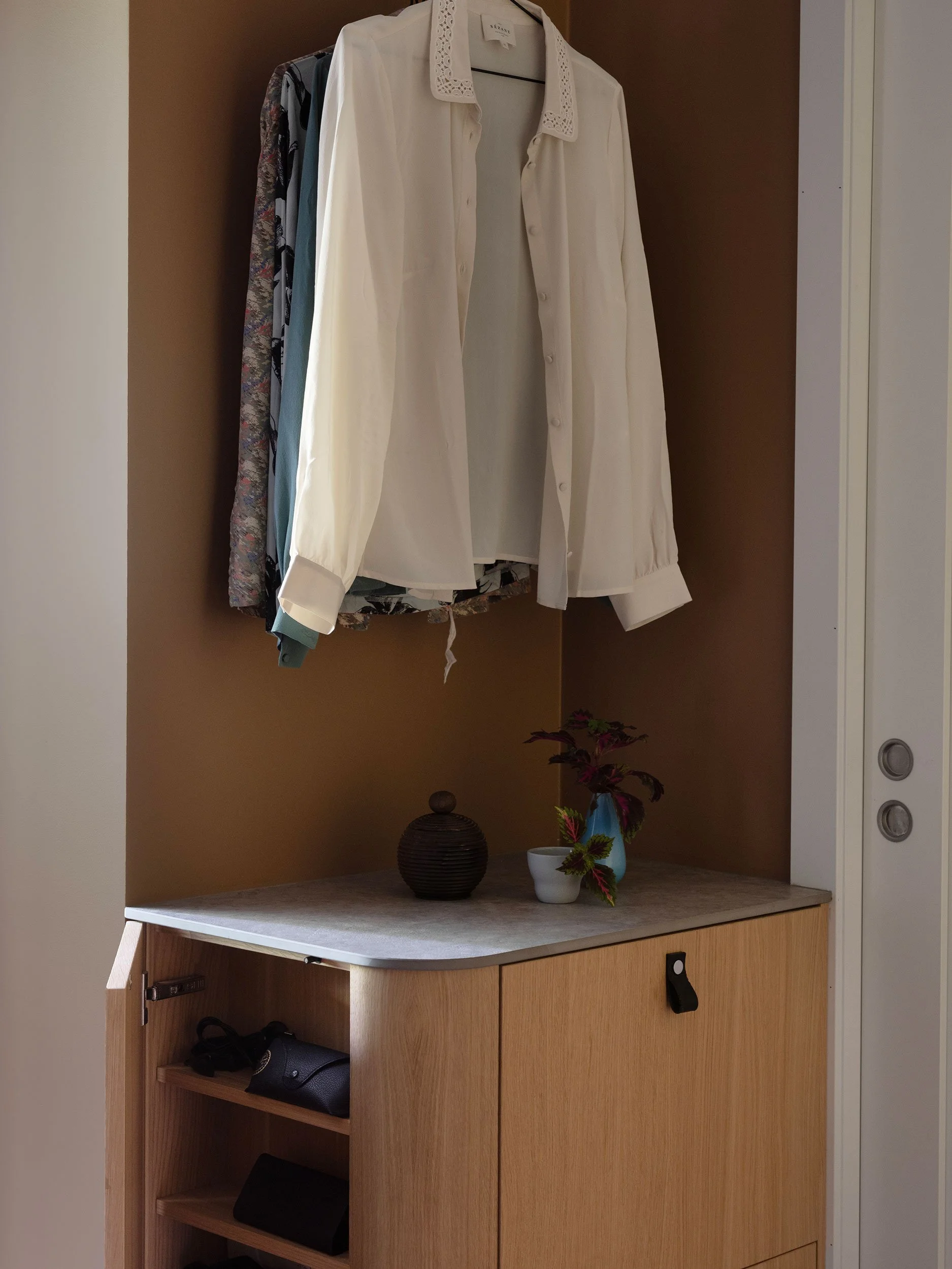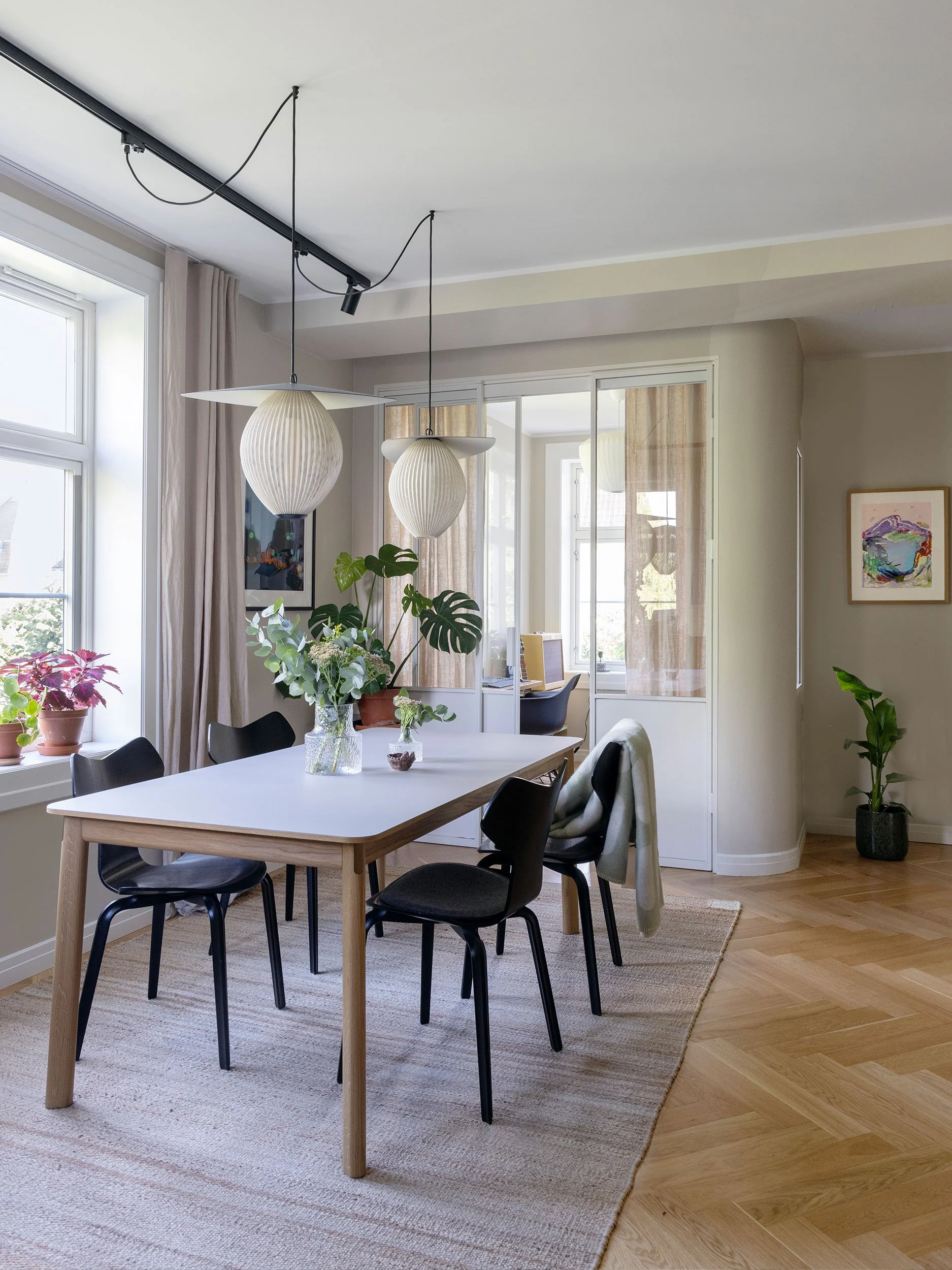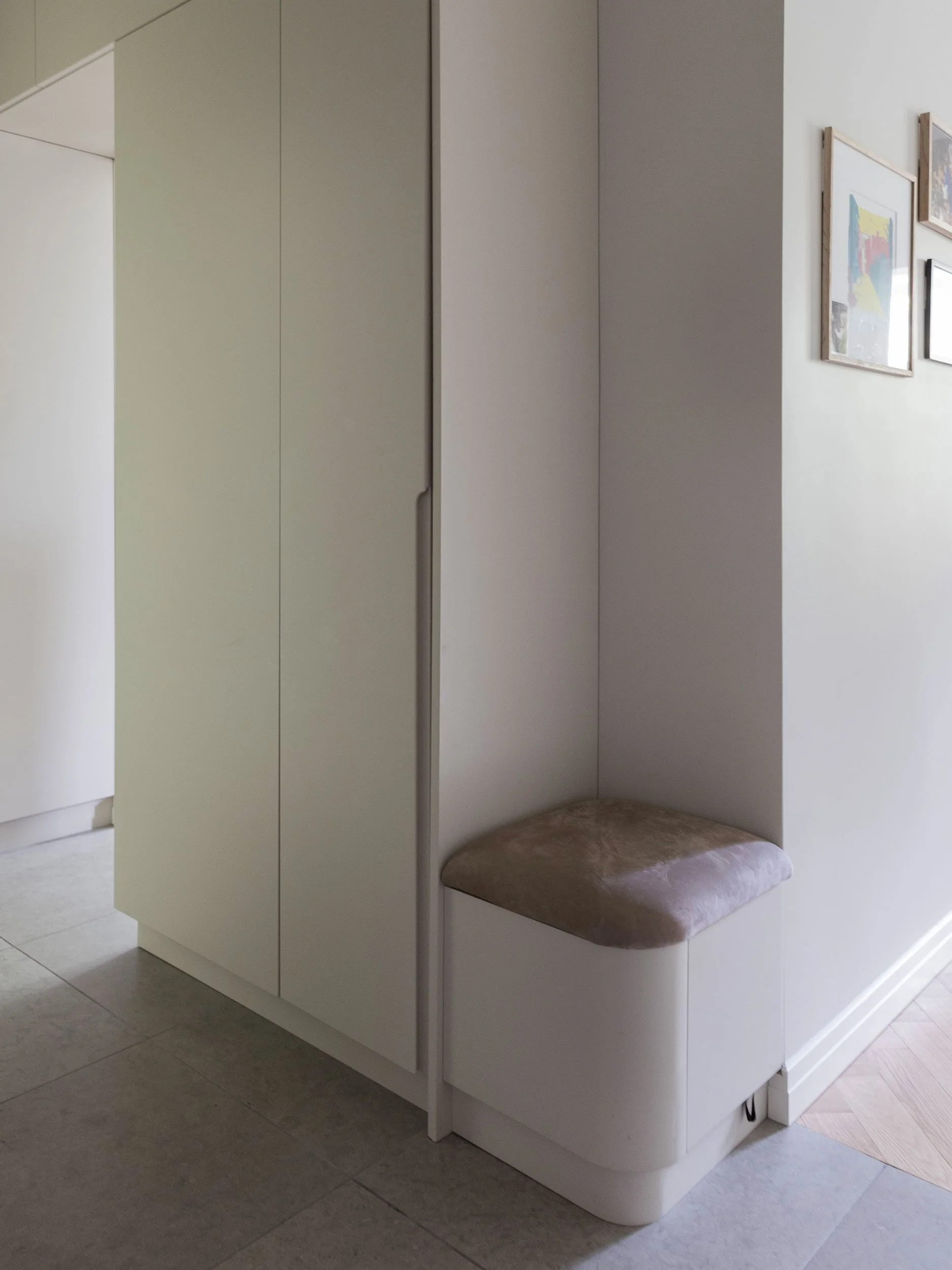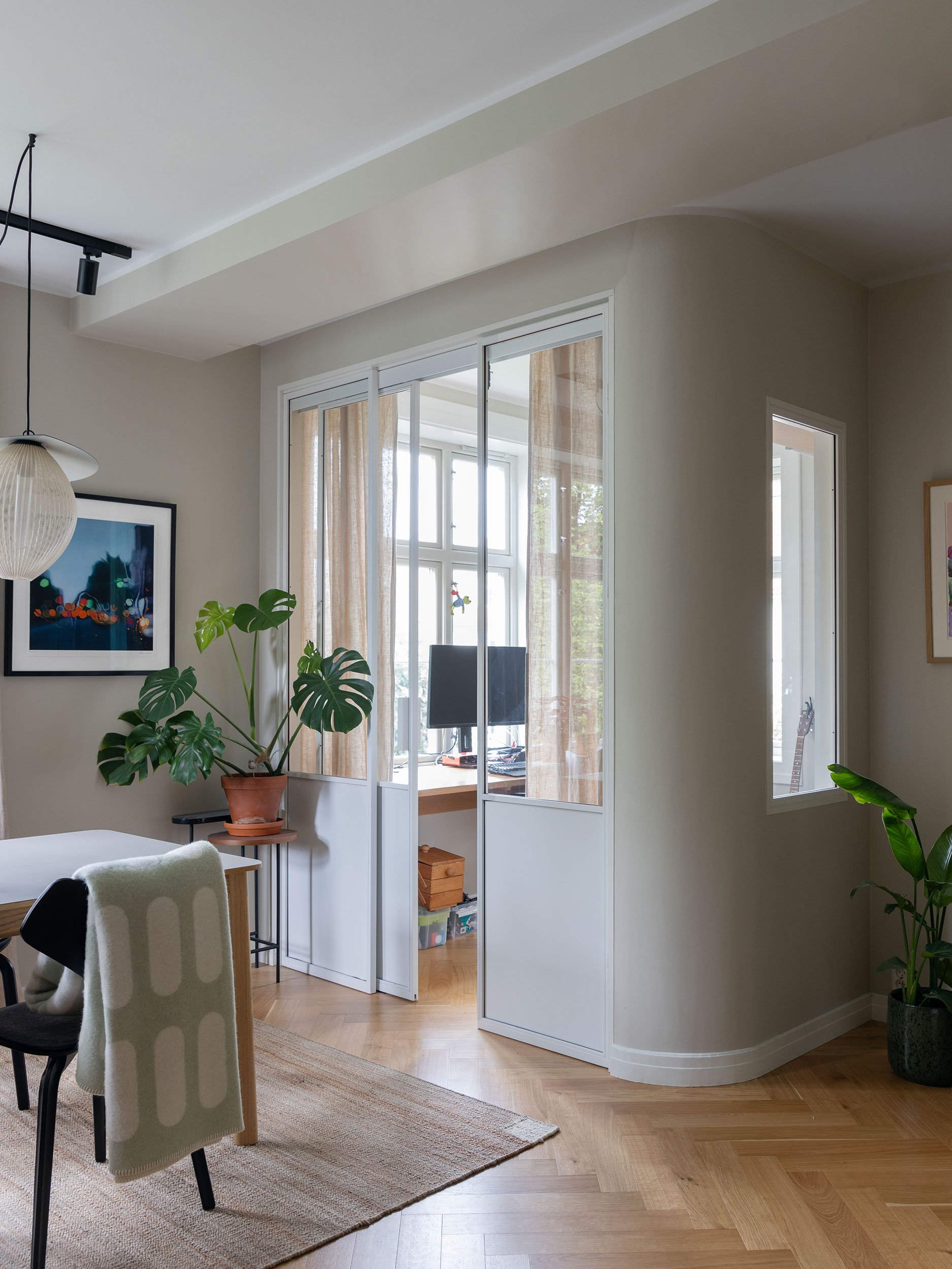 Planløsningen er nøye bearbeidet for å gi bedre flyt og maksimal plassutnyttelse. En rolig materialpalett med beige og naturtoner kombineres med mørk eik og sorte detaljer, og gir boligen et varmt og helhetlig uttrykk. Et nytt hovedsoverom er etablert der det tidligere lå to alkover, utformet som en lun og avskjermet suite med vegg-til-vegg-teppe og skyvedører. Badet er utvidet ved å hente areal fra gangen, og rommer nå både badekar og dusj, i tillegg til vaskerom og walk-in garderobe integrert i en plassbygget løsning. Kjøkkenet er flyttet til midten av leiligheten og fungerer som et naturlig samlingspunkt, mens det tidligere kjøkkenet er gjort om til et fleksibelt rom for hjemmekontor, gjester og musikk, rammet inn av en buet vegg med glass og skyvedør som slipper lyset videre inn i boligen.
