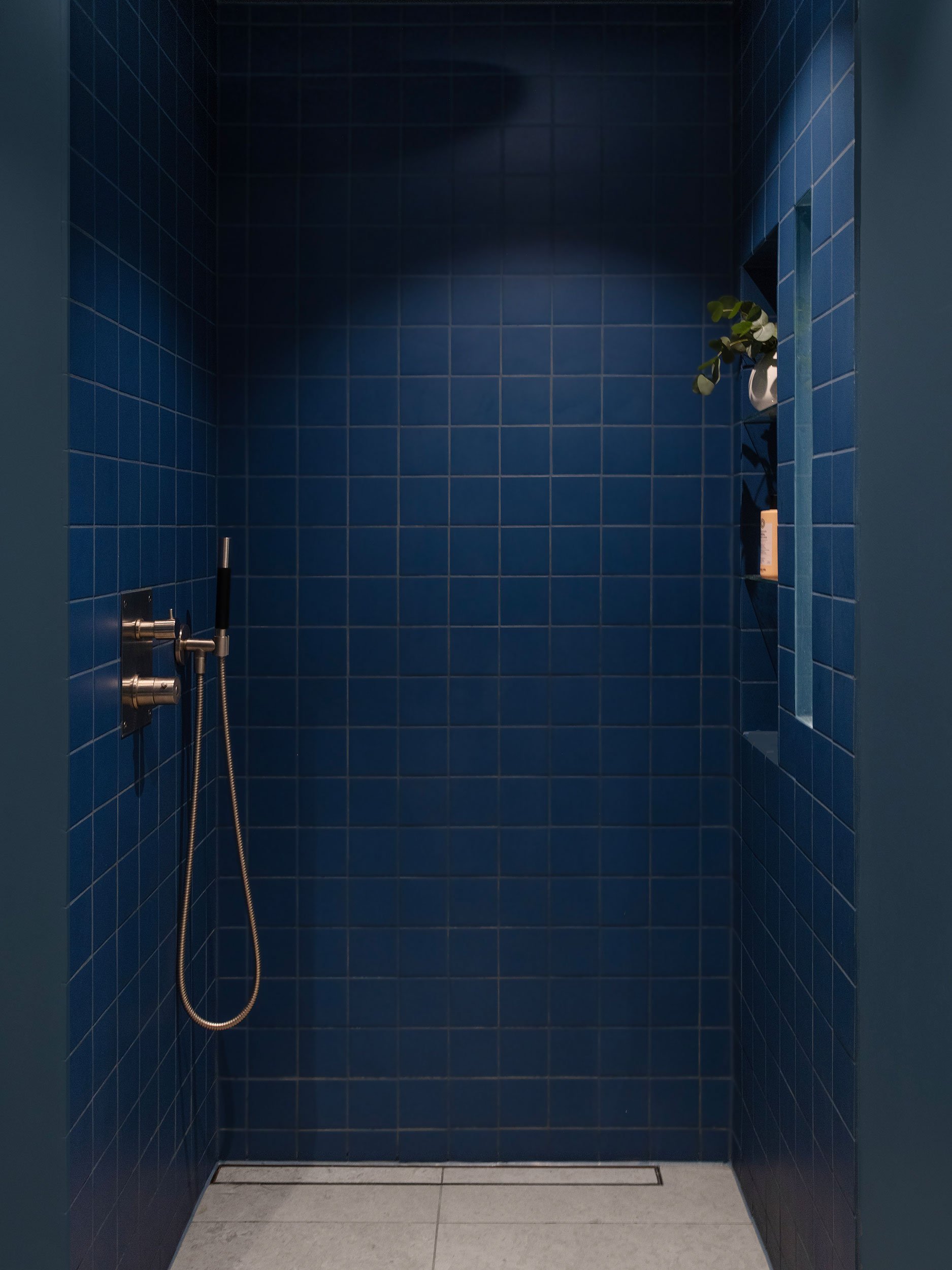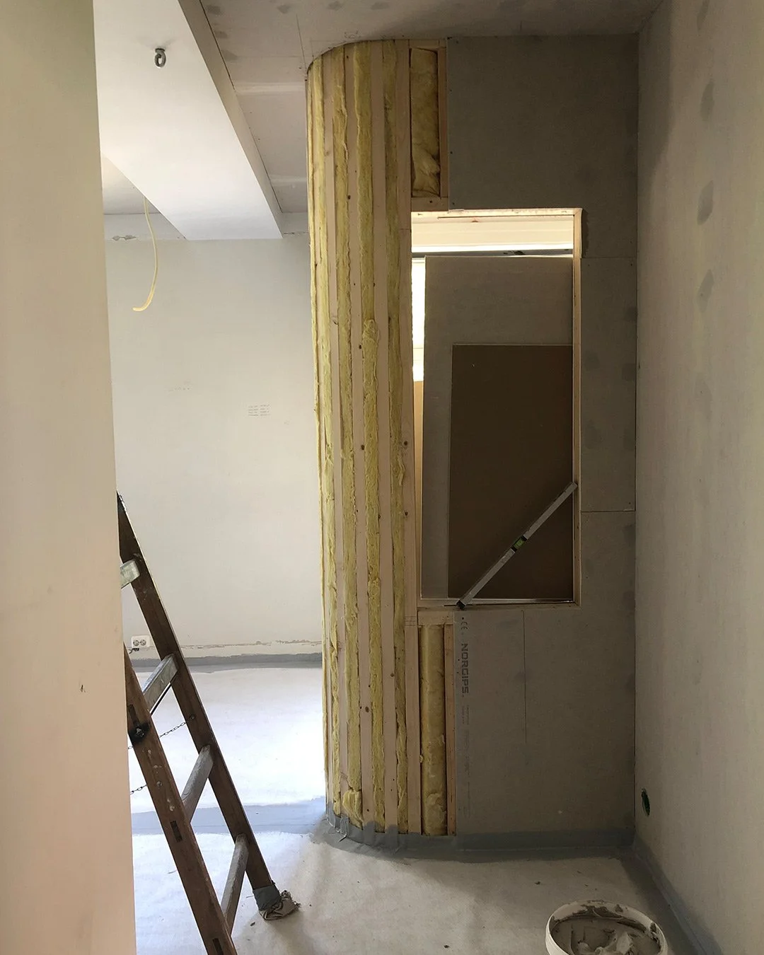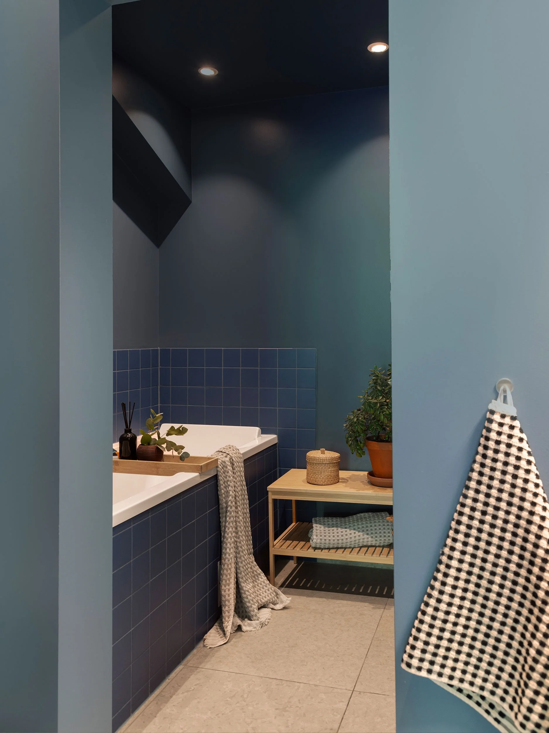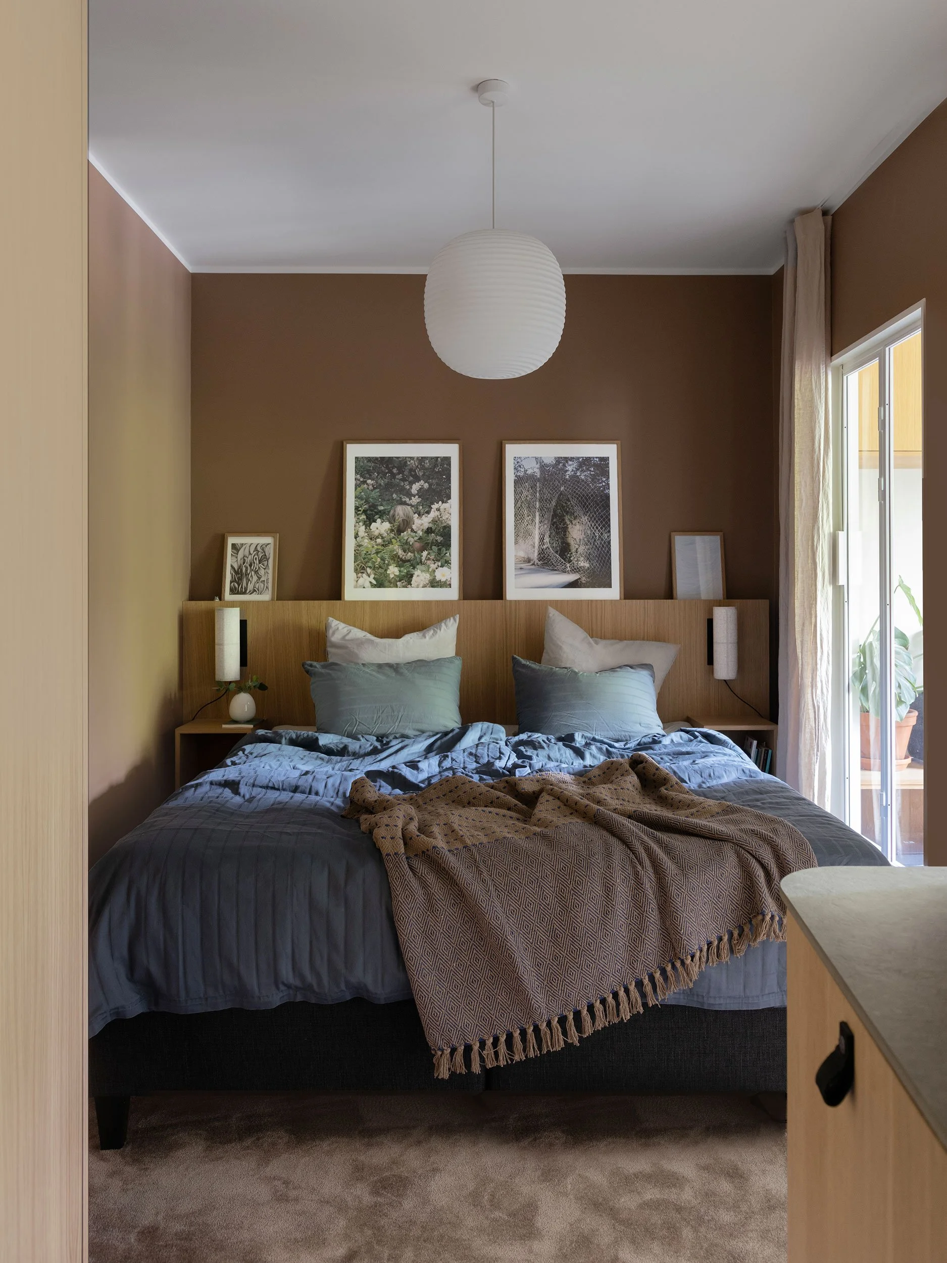 Planløsningen er nøye bearbeidet for å gi bedre flyt og maksimal plassutnyttelse. En rolig materialpalett med beige og naturtoner kombineres med mørk eik og sorte detaljer, og gir boligen et varmt og helhetlig uttrykk. Et nytt hovedsoverom er etablert der det tidligere lå to alkover, utformet som en lun og avskjermet suite med vegg-til-vegg-teppe og skyvedører. Badet er utvidet ved å hente areal fra gangen, og rommer nå både badekar og dusj, i tillegg til vaskerom og walk-in garderobe integrert i en plassbygget løsning. Kjøkkenet er flyttet til midten av leiligheten og fungerer som et naturlig samlingspunkt, mens det tidligere kjøkkenet er gjort om til et fleksibelt rom for hjemmekontor, gjester og musikk, rammet inn av en buet vegg med glass og skyvedør som slipper lyset videre inn i boligen.